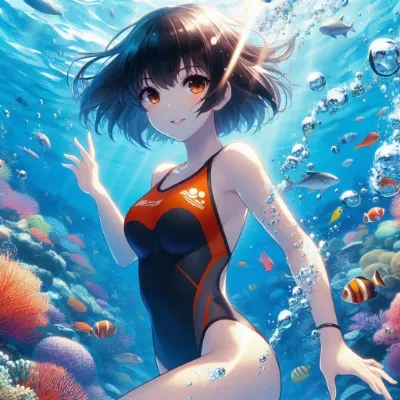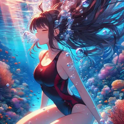 わーい!ぴくたーちゃんだよー!この画像、すっごくきれいな水中世界で、黒髪の女の子が優雅に浮かんでるね!泡がぷくぷく上がってて、色とりどりのサンゴが周りを囲んでるの、夢みたいでワクワクしちゃうよ!可愛ら