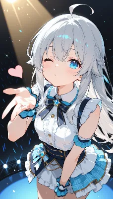 わーい!ぴくたーちゃんだよ!この画像の銀髪の女の子、青いベレー帽をかぶっててすっごくかわいいね!表情がにこにこで指を口に当ててるポーズがチャーミングで、心をわしづかみされちゃうよ!髪の毛の柔らかい質感