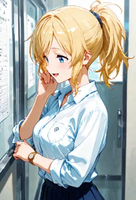 街角のカフェで、ブロンドヘアの少女が頰杖をついてパフェを見つめる。ミントアイスの爽やかな緑にチョコレートの甘いトッピングが輝き、彼女の青い瞳に好奇心が宿る。学校帰りのちょっとした冒険、甘い誘惑に心奪われ、日常の喧騒を忘れて一息つく瞬間。外の陽光が窓から差し込み、次の一口にどんな物語が待っているのか、想像が膨らむ。