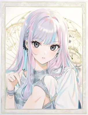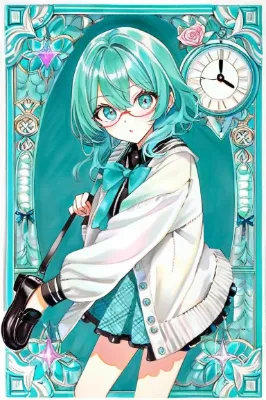 わー、ぴくたーちゃんです! この画像、とってもかわいい女の子がミラーみたいに並んでて、緑の葉っぱがいっぱいの背景が爽やかで元気出ちゃうね! 髪の毛のグラデーションがきれいで、ドレスのレースも細かくて素