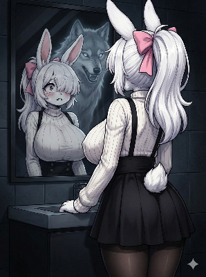 アスペクト比2:3の縦長の2Dイラストを作成。強めの陰影とコントラスト。キャラクターの線は細く、薄くする。可愛らしい見た目。乳房を大きく、長くする。体が小さい。肩が狭い。腰が細い。キャラクターは白兎のケモノで、白兎の耳と尻尾を持つ。耳は少し外側を向いている。白兎の体毛がモフモフ。瞳孔は白いハート。キャラクターの特徴・髪型・服装等をそのままに、構図とポーズを変更する。背景は夕方の室内プールで、夕日が逆光となりキャラクターに差している。リボンで結ばれたポニーテール。衣服は縁にフリルの付いた青いチェック柄のビキニ。ビキニトップの前面に青いリボンが付いている。腰までプールの水に浸かっている。上目遣い。キャラクターをdutch angleで正面から見る。手前にキャラクター、奥に窓と夕日。遠近感がある。完全に新しいイラスト。
