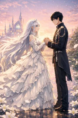 深い森の奥、月明かりが差し込む夜に、銀髪の姫が静かに現れる。彼女は古の森の守護者で、青い花の冠をまとい、白いドレスを纏って秘密の儀式を執り行う。優しい青い瞳が、失われた記憶を呼び起こすかのように輝き、周囲の花々が優しく揺れる。この瞬間、彼女の冒険が始まる。森の精霊たちが見守る中、どんな物語が紡がれるのだろうか?