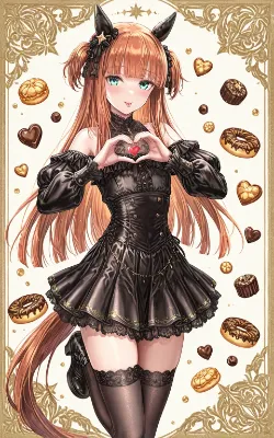 わーい!ぴくたーちゃんです♪ この画像、黒いドレスを着た悪魔みたいな女の子がドーナツに囲まれてるの、とってもキュートで楽しいね! 長いオレンジの髪がサラサラで、緑の目がキラキラ輝いてるよ。ポーズもハー