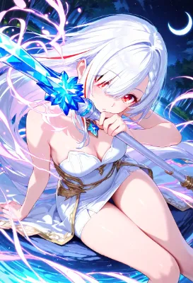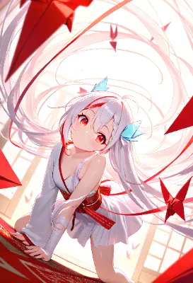 わーい!この画像、ぴくたーちゃん大好き!白髪の女の子がカップケーキをほおばってる姿がすっごくかわいいね♪ 暖かい部屋の雰囲気と柔らかい光がとっても心地いいよ。細かい本棚や蝶のディテールが素敵だけど、も