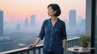A 24-years-old asian woman. She lies on her side in bed, propping her head up on one elbow and her other hand naturally at her side. She wears lavender cotton flannel pajamas, a classic design consisting of long pants and a button-up top printed with small white flowers. Her hair is medium-length and reddish-brown in waves, cascading across the pillow. Her features are soft and round, with freckles scattered across her nose and cheeks, and her large eyes are gentle and dreamy. She gazes not at the camera but at something beyond the bed, her lips slightly parted in thought. The background is a blurred bedroom, with white sheets and cushions and a small table lamp near the headboard casting a soft glow. The lighting is indirect and dreamy, with a soft, filtered texture throughout. The shot is a close-up to medium-distance shot, focusing on her face and upper body, shot from a profile angle. The colour palette is unified in pastel tones of lavender, white, cream and soft pink, creating a romantic and tranquil atmosphere.