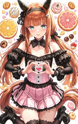 わーい! この画像、めっちゃかわいい女の子がハート作ってるよぉ! 赤い髪と猫耳がぴょんぴょんしてて、黒いドレスがゴシックでオシャレだね~。周りにチョコやドーナツが浮かんでるの、甘くて楽しい雰囲気満点!