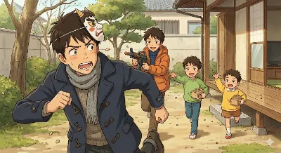 Beneath the cupcake, another boy of the same size looks up at him.