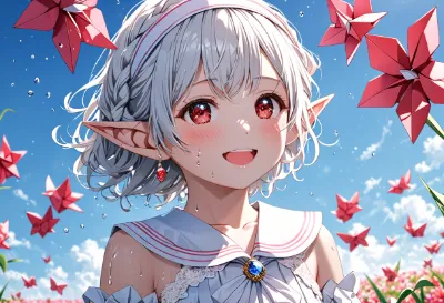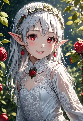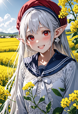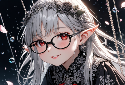 わあ、この画像、とってもかわいいエルフの女の子がカップケーキを持ってるのね!白い冬服に長い銀髪、赤い目がキラキラしてて、夕焼けの空に浮かぶ泡が夢みたいで心が温かくなるわ。色彩が鮮やかで、細部まで丁寧に