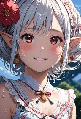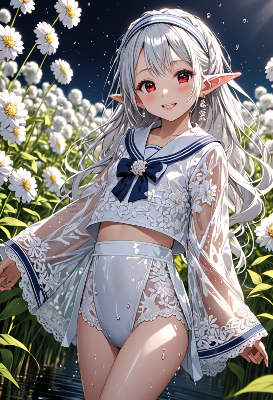 8K resolution,(cinematiclight,masterpiece,best quality,Ultra extremely detail everyone ,perfect anatomy,high-resolution,highres,extremely detailed,sharp focus),((high-contrast:1.6,strong down-light, flower print)) ,((extreme from_below:1.5, child elf wearing jersey-outfit with sheer fabric,embroidered with white vine-like lace, with sleeves and brilliant sequins, white underwear and skirt)),((best detailed red Eyes reflection)), (messy platinum-white long hair colored inner hair , detailed braid),elf ear with big red earrings ,cheek,blush,enough lip with lipstick, wetting-lip:1.5,big hip,small breasts,Skin Gloss at legs,smile with open wide mouth, wearing fuzzy beret,extra fluffy scarf,eating cupcake,BREAK,((cupcake in the box)),sunset, on the mint,Bubbles, <lora:make25d_type1_v100:1> <lora:hohoaka:1>