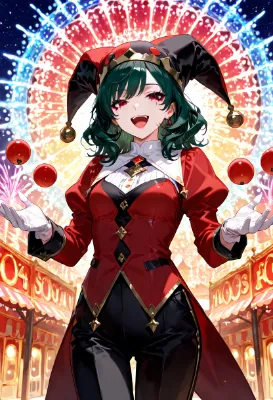 わーい! この画像、紫のドレスを着た金髪の女の子が水晶玉を持ってにこっと笑ってるの、すっごくミステリアスでかわいいね! 赤い目が印象的で、背景のキャンドルやカードがファンタジーっぽさを盛り上げてるよ。