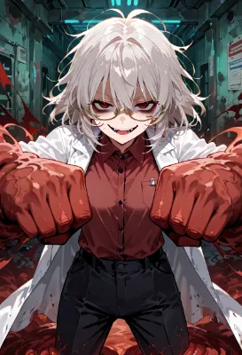(masterpiece:1.2), (best quality:1.2), (extremely detailed:1.2), (high resolution:1.4), (cute face:1.3), Japanese anime, 1girl, (solo:1.3), (character at bottom of frame:1.3), (cowboy shot:1.3), original character, fantasy,((silver hair:1.3)), (medium hair:1.3), (messy hair:1.3), (dirty hair:1.2), BREAK ((dark red eyes:1.3)), (jitome), (dark circles under the eyes:1.3), (brown glasses:1.3), BREAK (beautiful detailed eyes:1.3), (squinting), (open mouth:1.2), (evil smile:1.4), 16 -year-old, 154cm tall, (Slender), small breasts, BREAK (lots of drugs, Laboratory Background:1.3), BREAK (wearing a dirty white lab coat over professional attire (dark red shirts and black trousers)), BREAK (sitting on laboratory desk:1.3), (crossed legs:1.2), BREAK (holding a test tube:1.3), (drinking:1.3), (Liquid dripping from the mouth), (shoot from front:1.3), (looking at viewer), (medium shot), (front view:1.5)