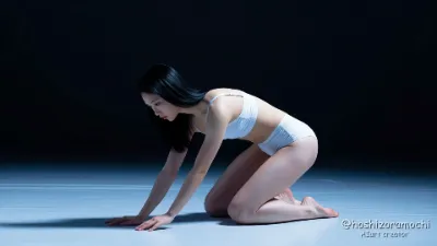 Asian woman in her 20s, white bra and white panties, long straight black hair flowing upward, minimalist modern concept, black void background, mid-jump pose captured in mid-air, body arched backward, arms extended to sides like wings, legs split in dynamic athletic position, hair defying gravity floating above, eyes wide open with exhilarated expression, mouth slightly open, backlit silhouette with thin outline of light, weightless floating sensation, dramatic low angle shot, powerful energy frozen in time.