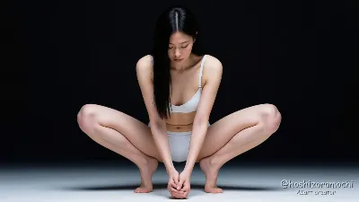 Asian woman in her 20s, white bra and white panties, long straight black hair, minimalist modern aesthetic, black background, lying flat on back, arms stretched above head parallel to body, legs extended straight with ankles crossed, face turned to side looking toward camera, mysterious subtle smile, hair fanned out in perfect semicircle, extreme low angle side view, body creating horizontal line, minimal side rim light, vast emptiness surrounding figure, horizontal composition emphasizing length.