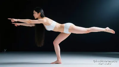 Asian woman in her 20s, white bra and white panties, long straight black hair, minimalist modern style, solid black background, crouching position balanced on balls of feet, knees spread wide, elbows resting on inner thighs, hands clasped together between legs, face looking down at hands, hair falling forward creating curtain, contemplative introspective expression, tight compact pose, high contrast top lighting, compressed energy, geometric triangular composition, tension in muscles visible, coiled spring metaphor.