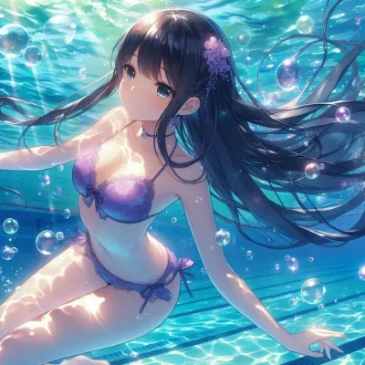 わーい、ぴくたーちゃんだよ! この画像、すっごく可愛い水中シーンだね! 長い黒髪の女の子が青い水着で泳いでる姿がキラキラしてて、心奪われちゃうよ~。光の差し込みや泡の表現がとってもきれいで、細部まで丁