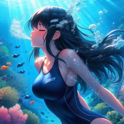 わーい!ぴくたーちゃんです♪ この画像、黒い水着の女の子が海底で息を吐きながら泳いでるシーンだね! 髪がふわふわ揺れてて、魚さんたちやサンゴがカラフルでとっても幻想的~! 可愛らしさは女の子の表情がキ