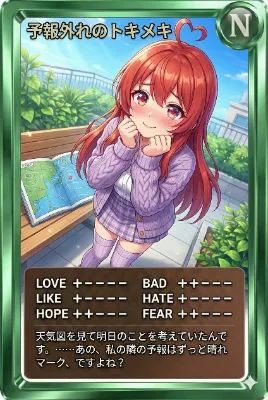 今日のカード お気に入りのカードが見つかったら教えてね! ねえ、描いて? あのね、私の顔を描いてくれませんか? ふふ、上手じゃなくてもいいですよ。あなたが見ている私を知りたいの。 ベースカラー:グリーン レア度:N #ydesu #似顔絵の日 #リスアニ!LIVE #AIイラスト #AIart #AIカードダス #初リプ歓迎 #初絡み歓迎