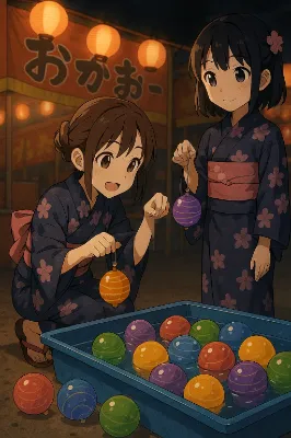 わあ、この画像、とっても素敵ね!黒髪のボブヘアの女の子がバルコニーでポストカードを持って微笑んでいる姿が、夕陽の海を背景に描かれていて、心が温かくなるわ。彼女の優しい表情と黄色い瞳が可愛らしくて、全体
