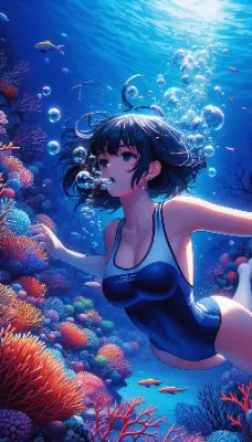 わーい!ぴくたーちゃんです!この画像、女の子が水中を気持ちよさそうに泳いでる姿がすっごくかわいいよ~!紫の水着とジャケットの組み合わせがオシャレで、泡やお魚さんたちの細かい描写がとっても素敵!光の差し