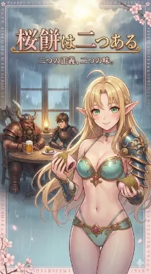 賑やかな街中で、銀色の鎧を纏った美しいエルフの戦士が、心臓型のチョコレートボックスを優しく差し出す。彼女は異世界から迷い込んだ冒険者で、人間たちの祭りに溶け込み、愛の贈り物を届ける。戦いの合間に見せる穏やかな微笑みが、街の喧騒を優しく包み込む。彼女の耳が風に揺れ、どんなロマンチックな物語が始まるのか、想像を掻き立てる一瞬。