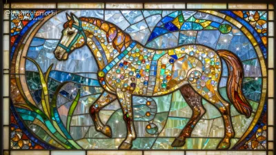 A white horse depicted in a stained glass window in a church, the transparency of the colored glass, the geometric composition separated by black lead lines, the beauty of the light passing through, the vivid red, blue, green and yellow glass fragments, the sacred atmosphere, the majesty of religious art, the circular composition like a rose window, shining with light from behind