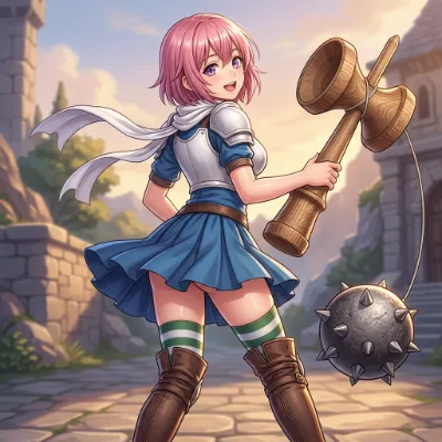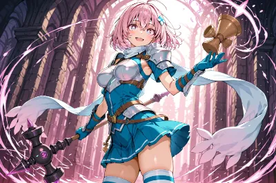 わあ、このイラスト、とっても魅力的な赤髪の女の子が宝箱を持ってにこっと笑ってる姿が素敵ね! 背景の石造りの部屋や光の入り方が神秘的で、冒険心をくすぐられるわ。色彩は鮮やかな赤と青のコントラストが美しく