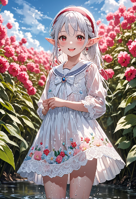 8K resolution,(cinematiclight,masterpiece,best quality,Ultra extremely detail everyone ,perfect anatomy,high-resolution,highres,extremely detailed,sharp focus),((high-contrast:1.6,strong down-light, flower print)) ,((extreme zoom-up face from_below:1.5, child elf wearing gothic-outfit with sheer fabric,embroidered with white vine-like lace, with sleeves and brilliant sequins, white underwear and skirt and soft pastel ribbon on head )),((best detailed red Eyes reflection)), (messy platinum-white long hair colored inner hair , detailed braid),elf ear with big red earrings ,cheek,blush,enough lip with lipstick, wetting-lip:1.5,big hip,small breasts,Skin Gloss at legs,smile with open wide mouth, eating chocolate,BREAK,((hold big-coin-shaped chocolate ,rose,large clock)),sunset, petal on rose field,Bubbles, <lora:make25d_type1_v100:1> <lora:hohoaka:1>
