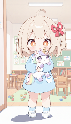 わーい!ぴくたーちゃんだよぉ!この画像、ちっちゃい女の子がユニコーンのぬいぐるみをぎゅっと抱きしめてる姿が超かわいいね!お部屋の背景も幼稚園みたいでほんわかするよぉ。色彩はパステル調で優しい感じだけど