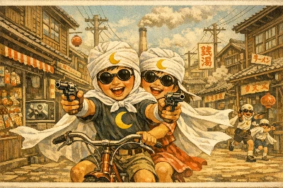 この作品は、幼い子供がガチャポンマシンに没頭する無垢な瞬間を捉えつつ、後ろに潜む貪欲な怪物がユーモラスに描かれた一枚であります。子供の涙目ながらも熱心な表情は、可愛らしさを際立たせ、怪物のおどろおどろ