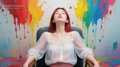 An Asian woman with dark chocolate brown, layered shoulder-length hair pulled back in a messy bun, with strands of hair falling around her face. She has intelligent eyes, laughter lines at the corners of her eyes, and a serious yet artisanal expression of concentration, with her mouth slightly turned up, and a slight crease between her brows. She wears a casual striped cotton shirt, with the sleeves rolled up above her elbows. There are CMYK ink splatters on the front and cuffs. The collar is open for a casual look, and she wears a navy apron around her waist. She stands in front of an old letterless printing press, holding down the large wooden rollers with both hands. Her upper body is leaning deeply toward the machine, her right foot half-stepped forward and resting her weight on it, her gaze fixed on the printed page. Her face is turned to the side, revealing a beautiful neckline. Her hair falls over her cheek, suggesting the motion of her work. The photographs have an analog, heavy atmosphere, almost like the smell of ink in the air; the four colors cyan, magenta, yellow, and black seem to float in the space; the contrast of light and dark illuminated by the work lights from the printing press against the slightly darker tones. The snapshot style has a documentary touch, and the composition, with a medium shot from a slight side, captures the realism of the work being done. In the background is a well-established printing workshop, with type cases and ink cans neatly lined up on shelves, past prints and typography samples tacked to the walls, and scraps of paper and ink stains on the floor telling of its history. The lighting environment is practical, combining natural light and work lights.