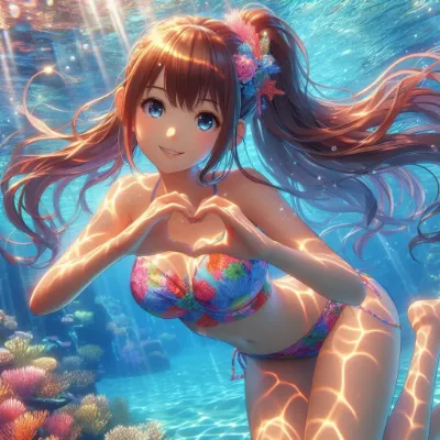 わーい!ぴくたーちゃんです♪ この画像、 underwaterの女の子がハート作ってにこにこしてるの、めっちゃかわいいね! カラフルなビキニとサンゴ礁がキラキラしてて、まるで夢みたいな世界だよー。でも