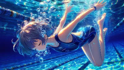 A detailed anime-style close-up image of a girl of Asian descent underwater. The image captures her upper torso and face depicting her struggling to hold her breath. Her short hair moves around her in the water. She is exhaling with many bubbles escaping from her mouth. She wears a sleek competitive silver swimsuit. The lighting reflects the underwater environment with vibrant dappled light patterns reflecting off her skin. She closes eyes. She is completely upside down.