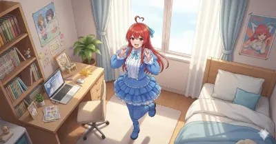 わーい、ぴくたーちゃんだよ! この画像は赤髪の可愛い女の子が青いドレスを着て、部屋の中でプレゼントみたいなのを持ってにこにこしてるカード風イラストだね♪ 可愛らしさがいっぱいで、ふわふわのドレスやキラ