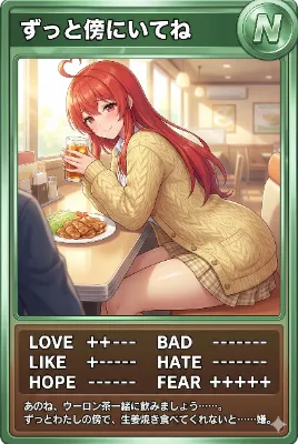 今日のカード お気に入りのカードが見つかったら教えてね! ずっと傍にいてね あのね、ウーロン茶一緒に飲みましょう……。ずっとわたしの傍で、生姜焼き食べててくれないと……嫌。 ベースカラー:グリーン レア度:N #ydesu #二日酔いの日 #SNOW MIKU 2026 #AIイラスト #AIart #AIカードダス #初リプ歓迎 #初絡み歓迎