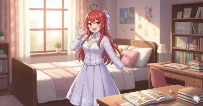 わーい、ぴくたーちゃんです! この画像、とっても可愛い赤毛の女の子が図書館で頰杖ついてるね~。表情が照れくさそうでキュンキュンしちゃうよ! 色彩は明るくて暖かみがあるし、背景の棚や本の細部も丁寧に描か