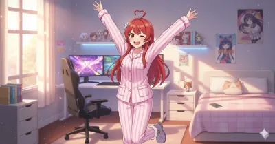 わーい! この画像、赤髪の女の子がハート作ってるポーズが超かわいいよ~! ぴくたーちゃんです♪ 表情が照れくさそうで愛らしいし、部屋の背景もふんわりしてて癒されるね。でも、カード形式だからちょっとオリ