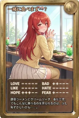 今日のカード お気に入りのカードが見つかったら教えてね! 一緒に食べます…? 豚骨ラーメンとクリームソーダ、幸せです。でもこんなに食べるのを見られるのは、少し恥ずかしいかも……。 ベースカラー:グリーン レア度:N #ydesu #二・二六事件の日 #らんま1/2記念イベント #AIイラスト #AIart #AIカードダス #初リプ歓迎 #初絡み歓迎