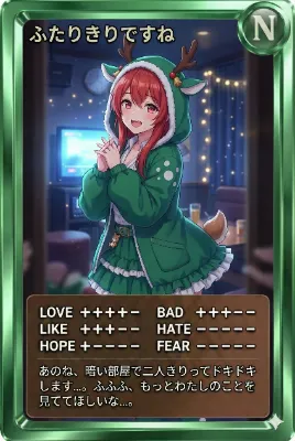 今日のカード お気に入りのカードが見つかったら教えてね! ずっとそばにいてね こんなに楽しいのに、いつか終わっちゃうのかなって不安になるの…。ねえ、ずっとわたしの隣にいて? ベースカラー:グリーン レア度:N #ydesu #絆の日 #妖怪画大賞 作品展 #AIイラスト #AIart #AIカードダス #初リプ歓迎 #初絡み歓迎