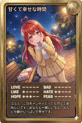 今日のカード お気に入りのカードが見つかったら教えてね! 甘くて幸せな時間 ふふふ、このキャンディとっても甘くて美味しいです。あなたと一緒にいると、なんだか胸がいっぱいで幸せです。 ベースカラー:グリーン レア度:N #ydesu #不二家の日 #コミケ50周年展 #AIイラスト #AIart #AIカードダス #初リプ歓迎 #初絡み歓迎