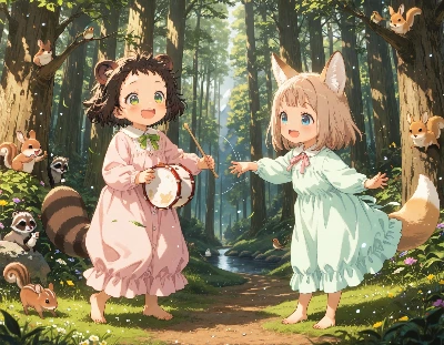 2girls, loli, mid, general, traditional media, picturebook-style, (watercolor and colored pencil texture), pastel colors, soft tone, no lineart, no outline, (drawing lines, Paper texture), ultra-detailed background, Very detailed costumes, (barasui:0.1), (oyari ashito:0.1), (masterpiece, best quality, amazing quality, very aesthetic, high resolution, ultra-detailed, absurdres,), soft lighting, warm light, gentle atmosphere, cowboy shot,