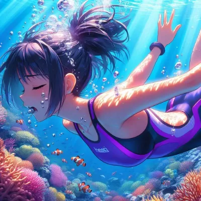 わーい!ぴくたーちゃんだよ!この画像、すっごくきれいな水中シーンで、女の子がリラックスして泳いでる姿がとっても魅力的だね♪ 泡やお魚さんたちが周りを彩ってて、まるで本物の海の中にいるみたい! 色彩が鮮