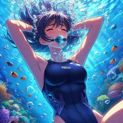 Detailed anime-style image of a girl of Asian descent unable to hold her breath while sinking at the bottom of the Coral Sea. She is wearing a sleek competitive sleeveless vivid pink swimsuit and has short, flowing black hair with high ponytail. She appears to be exhaling or struggling underwater, with many bubbles escaping from her mouth. The underwater scene is filled with vibrant light patterns from the sun, colorful fish. She closes eyes. She is completely upsidedown.