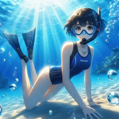 わーい!ぴくたーちゃんです♪ この水中を泳ぐ女の子のイラスト、すっごくきれいで夢みたいだよ! 黒髪のポニーテールがふわっと揺れてて、紫の水着がキュートにフィットしてるね。泡やサンゴ礁、かわいい魚さんた
