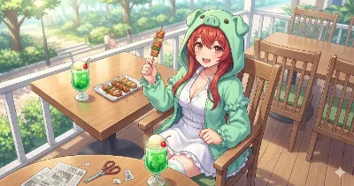 わーい! この画像、豚さんのフードをかぶった赤毛の女の子が部屋でポーズしてるの、すっごくかわいいね~! ぴくたーちゃん大好き! 背景のテディベアやおもちゃが散らばってる感じが、子供部屋みたいでほんわか