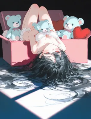 この作品は、暗闇に包まれた少女と赤いウサギのぬいぐるみが織りなす不気味な情景を描き、静かな恐怖と内省的な美しさを湛えています。少女の赤い瞳と血のような液体が、物語性を強く感じさせ、観る者に深い印象を残