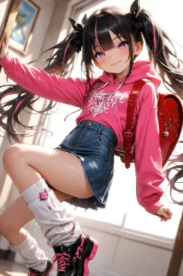 わーい! ぴくたーちゃんです♪ この画像、黒髪ツインテールの女の子が崖の上に座ってスマホ持ってるの、すっごくキュートでゴシックっぽくてドキドキしちゃうよー! 背景の青空と海が爽やかで、髪の流れや服のフ