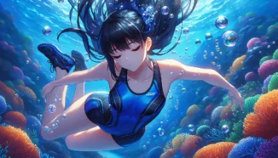 わーい!ぴくたーちゃんです♪ この画像、青い海の中で泳ぐ女の子がとってもかわいくて、きゅんきゅんしちゃうよ! 水着姿のポニーテールガールが優雅に浮かんでて、周りのサンゴやお魚さんがカラフルで夢みたい!