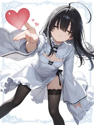1girl, solo, black hair, hair over eyes, ahoge, long hair, closed eyes, small breasts, white dress, frilled dress, long sleeve, black corset, black thighhighs, BREAK