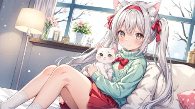 冬の訪れとともに、少女は雪景色に包まれた富士山を眺めながら、幼い頃の約束を思い出す。白い息を吐き、手袋を握りしめて座る彼女の瞳には、遠くの山並みが映る。桜の花びらが雪に混じり、儚い美しさを添える。この瞬間、彼女は新たな冒険への一歩を踏み出そうとしている。風が優しく髪をなびかせ、静かな物語が始まる予感がする。