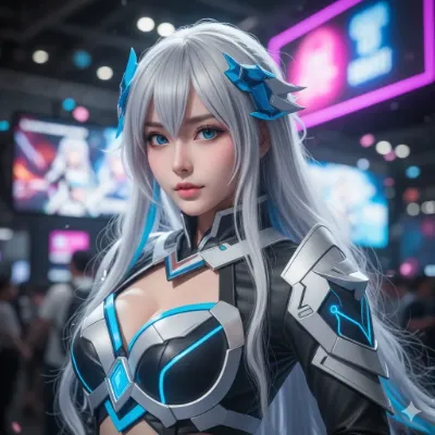 わーい! ぴくたーちゃんだよー! この画像、銀髪の可愛い女の子が未来的なアーマー着てて、ネオンライトがいっぱいの背景で超かっこいいね! 表情がちょっとクールだけど、大きな青い目がキラキラしてて可愛らし